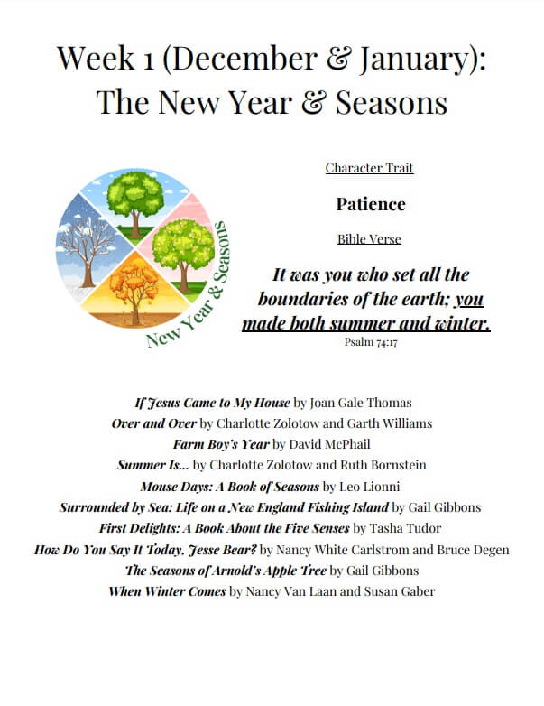 Picture Book Preschool is a preschool curriculum by Sherry Early based on picture books that she has been reading to her children for the past twenty years. Each week of Picture Book Preschool is built around a theme, and includes a suggested character trait to work on, a Bible verse, and seven suggested picture books to read to your children.